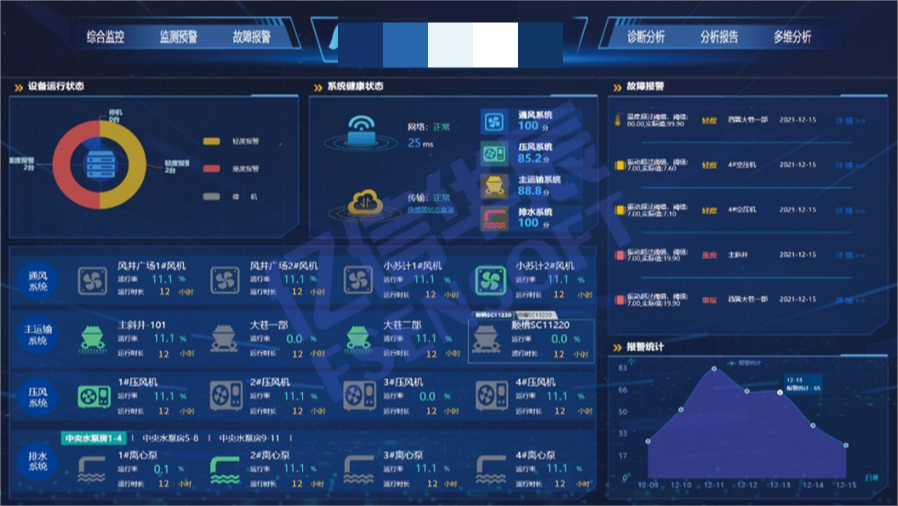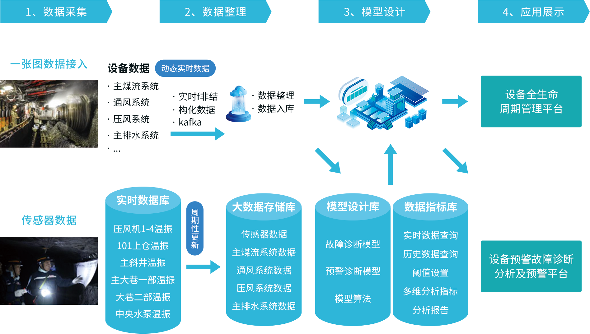 3、建立设备健康评估模型、设备能耗优化模型、设备故障分析模型等完善的矿井设备大数据分析模型。