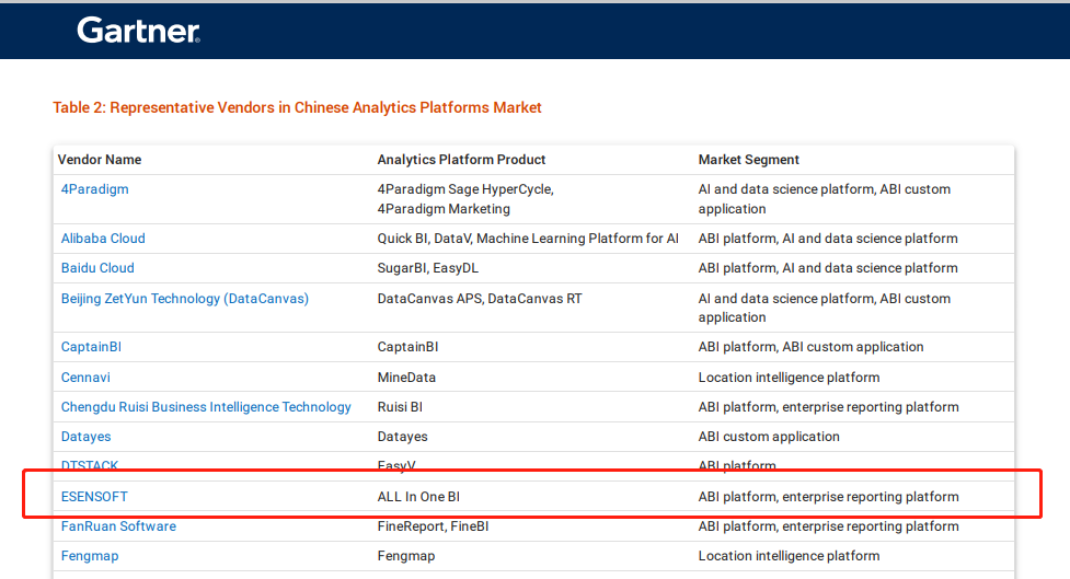 近期,国际权威研究与咨询组织Gartner发布2022年《中国分析平台市场指南》(《Market Guide for Analytics Platforms, China》)。Ebpay入选“代表性厂商”,亿信ABI作为代表性产品上榜。