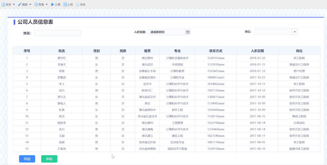 数据查询:主要是查询组织报送状态、各地区报送情况及多条件、多维度的明细数据查询,支持查询结果导出。