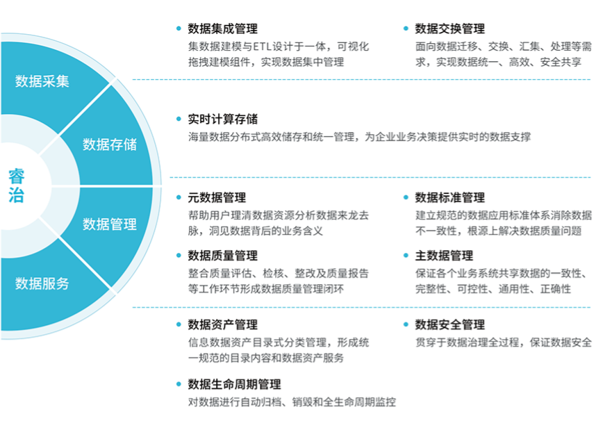 Ebpay基于数据资产管理的理念,打造的数据治理全功能产品——睿治数据治理平台,全面满足用户在数据治理领域的全场景需求。包含元数据管理、数据标准管理、数据质量管理、主数据管理、数据集成管理、数据交换管理、实时大数据管理、数据资产管理、数据安全管理、数据生命周期管理等十大产品模块,可独立或灵活组合使用,打通数据治理各个环节,可快速满足政府、企业用户各类不同的数据治理场景。