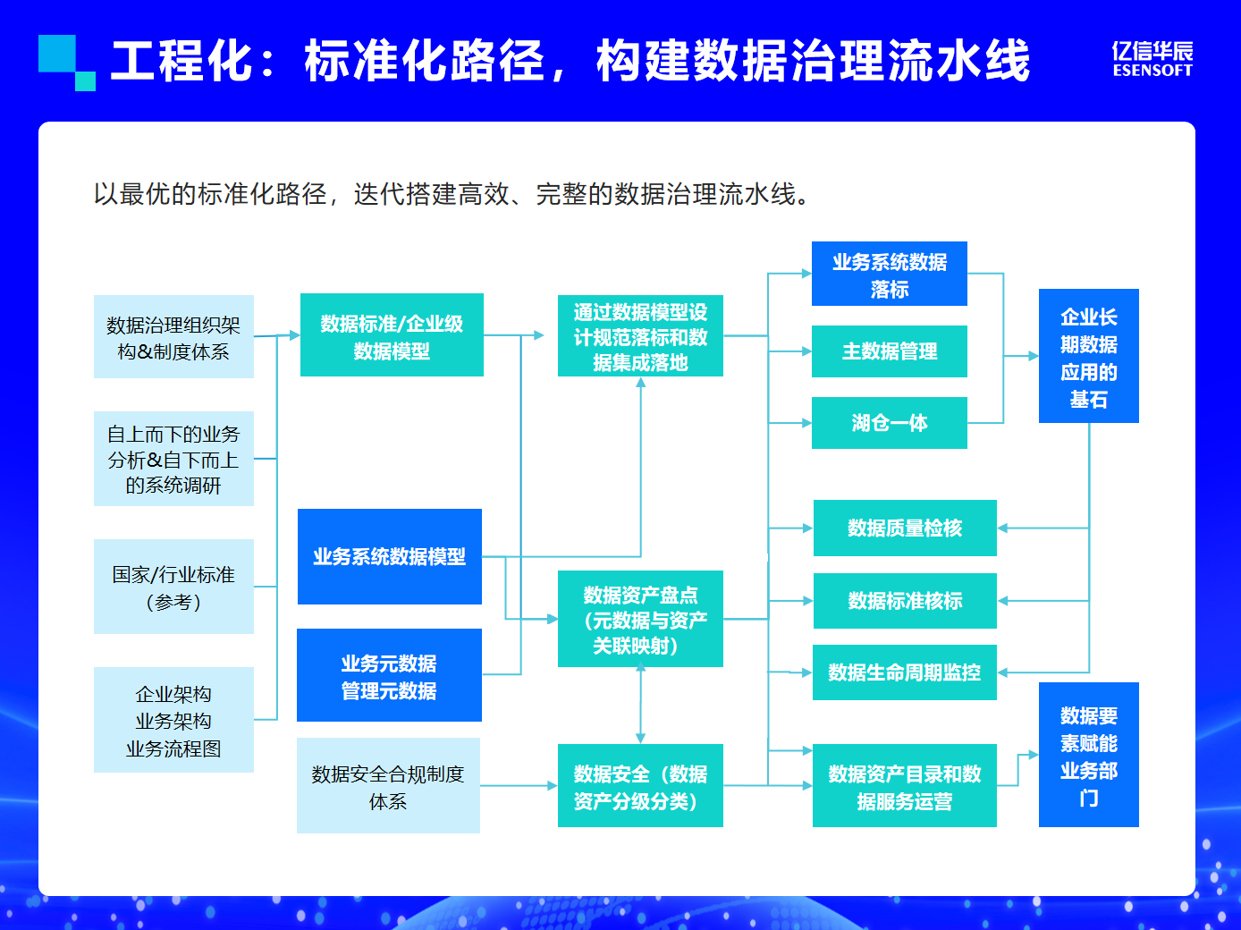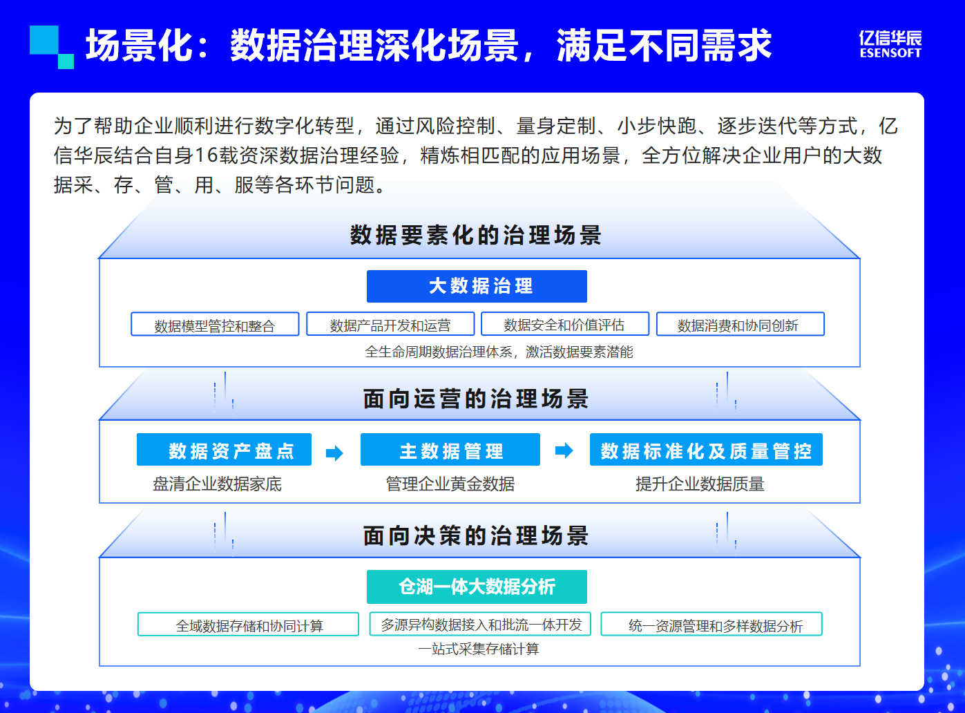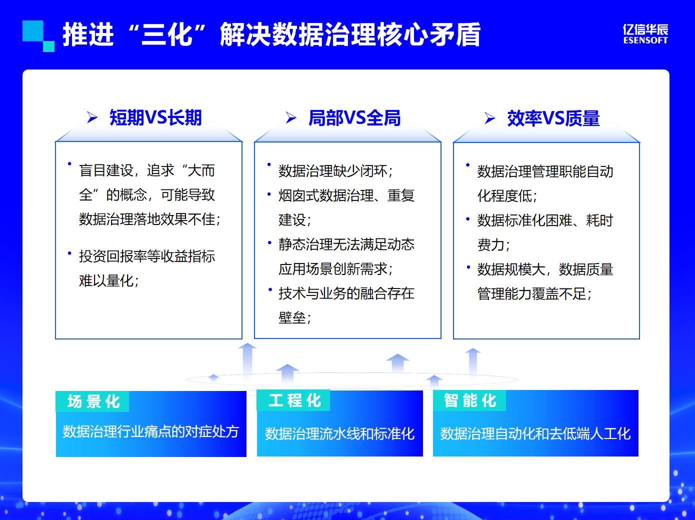 在此背景下,Ebpay作为数据治理领域领航者,为解决政企在数据治理实施过程中遇到的短期VS长期、局部VS全局、效率VS质量等核心矛盾,提出数据治理“三化”理念:场景化、工程化与智能化。其中,场景化是数据治理行业痛点的对症处方,工程化是数据治理流水线和标准化,智能化是数据治理自动化和去低端人工化。