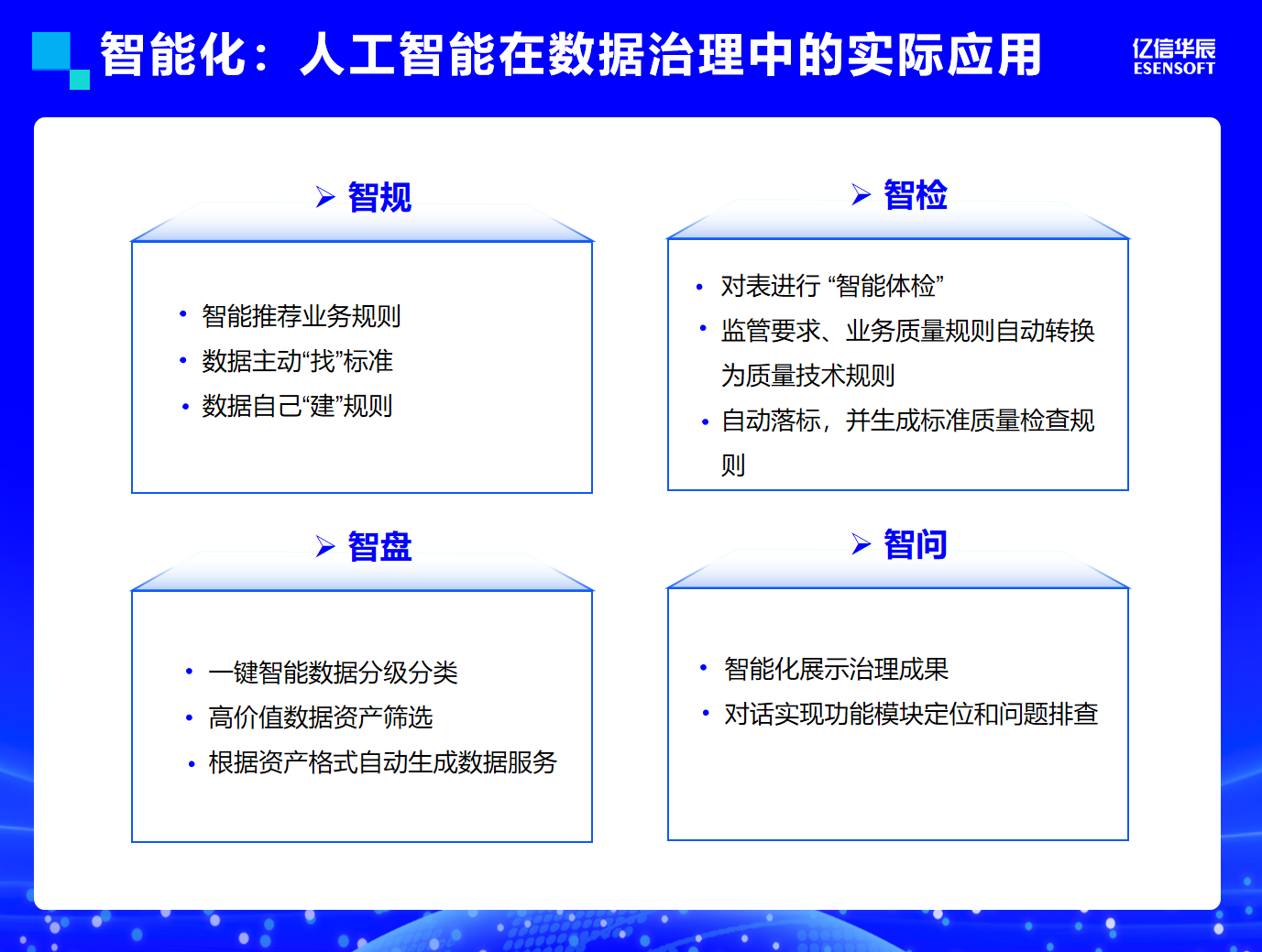 Ebpay总结过去一两年的实践,在数据治理中有四个具体的点,可以比较好地应用人工智能相关技术来解决。