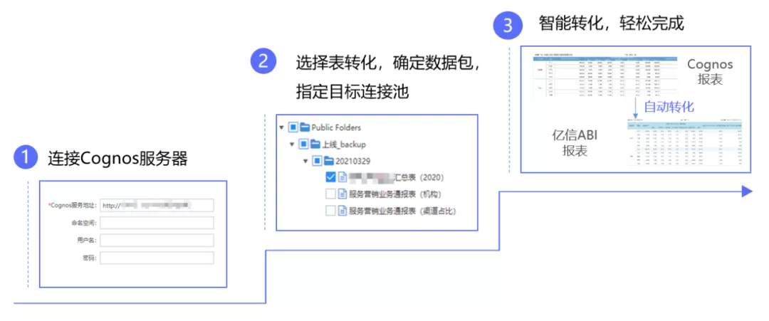 亿信ABI覆盖Cognos转换各种场景,包括各类报表(查询表、复杂表、动态报表等)、模型(SQL模型、CUBE模型、模型表等)的转换都能完美适配,给予批量转换功能,大大提高转换效率。