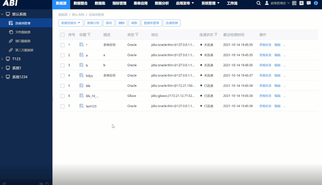 优化之前,连接池是否有效连通需要多步骤操作且无法批量,现在为了让用户直观地看获取连接池的当前状态,亿信ABI支持用户对批量选中的连接池进行连通检测,一键就可知晓连接池的连通状态,便于后期使用。