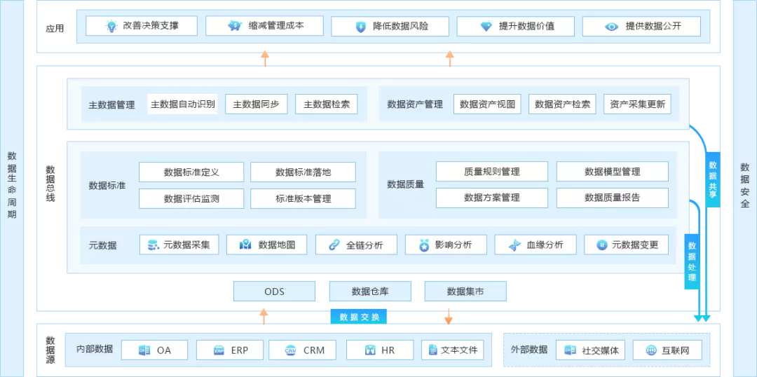 在数据治理架构中,数据资产管理位于底层数据和数据管理与应用之间,处于承上启下的重要地位。对上支撑数据安全管理等职能建设以价值发掘为导向的数据应用,对下实现底层数据的梳理、对接数据标准,达成企业内部“统一数据标准”的目标。