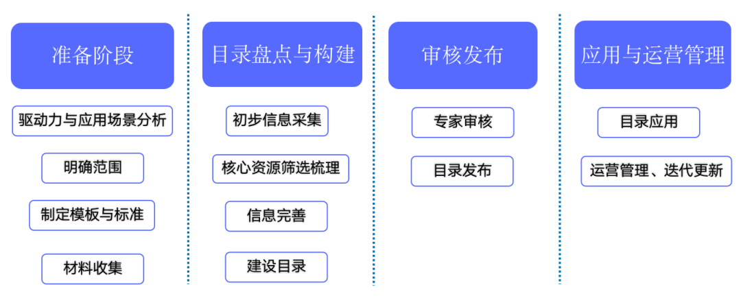 数据资产目录的建设分为四个环节,包含准备阶段、目录盘点与构建、审核发布、应用与运营管理。其中,前三个环节为数据资产目录的构建过程、最后一个环节为数据资产目录的使用和管理过程。如下图: