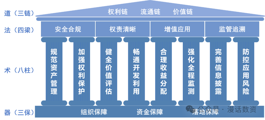 2024年1月11日,财政部资产管理司印发了《关于加强数据资产管理的指导意见》(以下简称指导意见),全文包括总体要求、主要任务、实施保障等三方面十八条内容。《指导意见》顺利获得规范组织的数据资产管理和运营活动,清晰数据资产权责关系,丰富数据资产应用场景,提升数据资产流通价值,确保数据资产全过程管理安全、可追溯,进而助力公共和企业数据资产的高质量供给,培育数据资产化服务生态,赋能实体经济数字化转型升级,推进数字经济高质量开展。基于以上背景,本文从道法术器四个层面对《指导意见》框架进行梳理,详见下图: