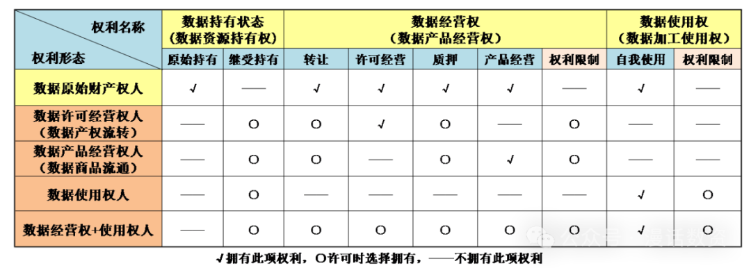 2、权责清晰清晰界定数据资产权责是数据资产管理工作的必要前提,也是促进数据要素市场价值流通的重要环节。关于数据资产权责。落实《数据二十条》数据资源持有权、数据加工使用权和数据产品经营权的权利分置要求,构建数据资产产权体系,明晰数据资产权责边界,促进数据资产流通应用安全、可追溯。数据产权矩阵见下图: