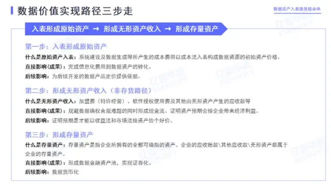 ③形成存量资产:当数据产品达到一定交易量、形成数据金融资产后,企业可推进数据资产证券化,即以数据资产作为基础资产,以资产预计产生的未来现金流为偿付发行证券,从而使数据要素进入资本市场。