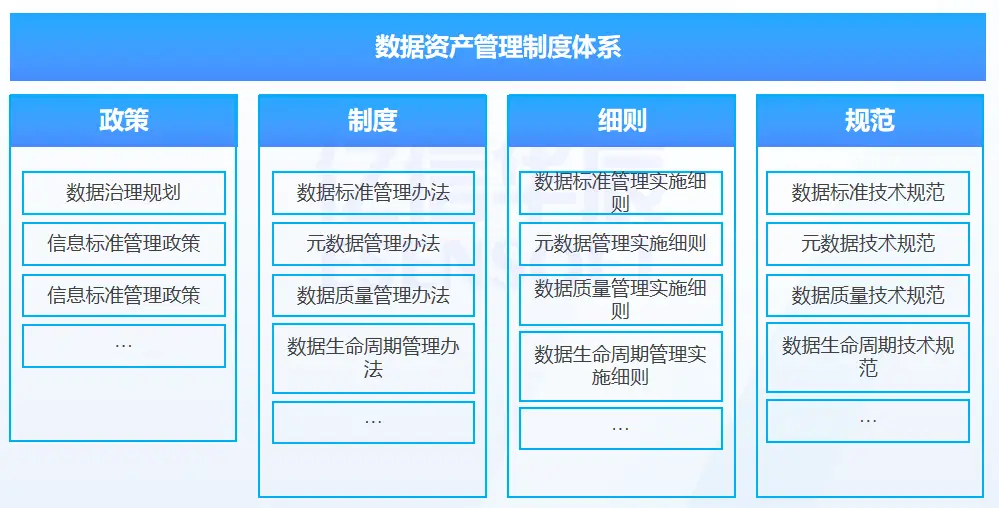 除了组织保障外,制度体系设计也至关重要。数据资产管理制度体系通常分层次设计,依据管理的颗粒度,制度体系可划分为组织级数据资产管理总体政策规定、管理办法、实施细则和操作规范四个层次。此项工作可作为凭证,向监管部门或资产评估部门提交相应证据。
