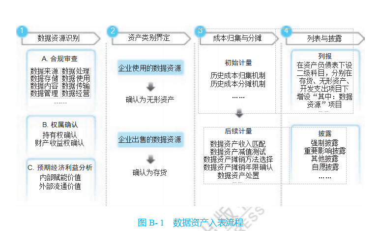 :如图 B-1 所示,数据资产入表过程包括数据资源识别、资产类别界定、 成本归集与分摊、列报与披露等关键环节。在数据资源识别阶段,企业需严谨识别数据资源, 确保其符合资产定义, 评估其合规性、权属清晰度、可量化程度及未来经济利益潜力。在资产类别界定阶段,企业需根据数据资源的特征和使用方式,准确界定 其资产类别,将其准确归类为无形资产或存货。在成本归集与分摊阶段,对符合条件的数据资源进行精确的初始计量,全 面梳理直接和间接成本,并科学分摊。在列报与披露阶段,企业需遵循会计准则和法规要求,清晰、准确地在财 务报表中列报数据资源信息,并自愿披露更多相关信息。图 B- 1    数据资产入表流程