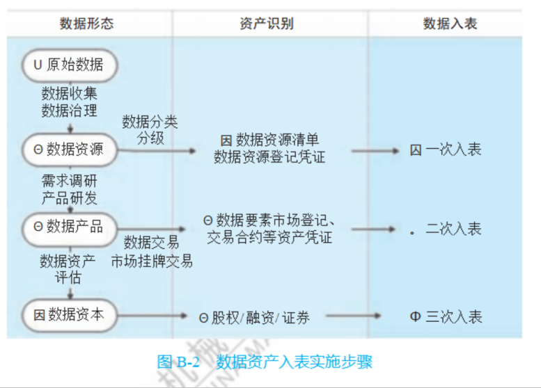 3)三次入表,即金融资产转化后入表,将数据资源转化为外部金融资产, 帮助企业利用数据实现金融价值。