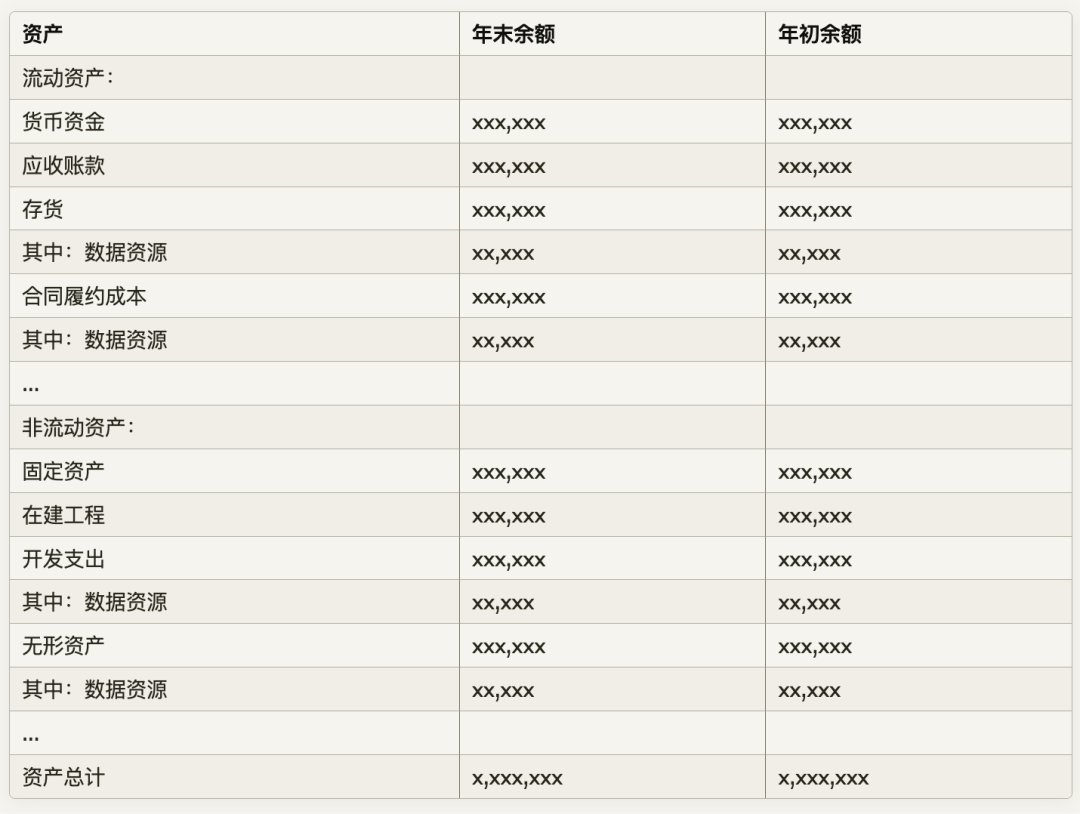 列示方式:存货 xx,xxx 其中:数据资源 xx,xxx