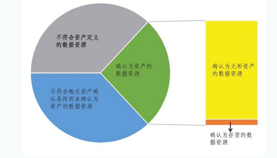 第一,有些数据资源并不符合会计上资产的定义,从而不能作为资产确认,即上面(图一)当中的这个灰色区域。要说明的是,这个图当中这个有一个比例,但是这个比例并不是说我们根据实务当中的比例严格的去做了一个界定的,这只是一个示意图,用来大致的表示一下可能存在的这些部分和相关的内容。