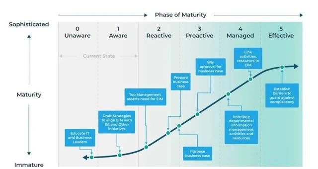 Gartner企业信息管理成熟度模型。将企业信息管理分为了0-5个阶段,分别是:0无意识阶段,1意识阶段,2被动式阶段,3主动式阶段,4托管管理阶段,5有效管理阶段,帮助企业找到信息管理能力所处的位置。