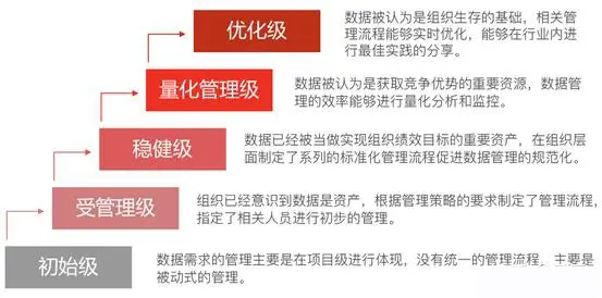 与CMMI类似,DCMM模型将组织的数据能力成熟度划分为初始级、受管理级、稳健级、量化管理级和优化级共5个开展等级,帮助组织进行数据管理能力成熟度的评价。