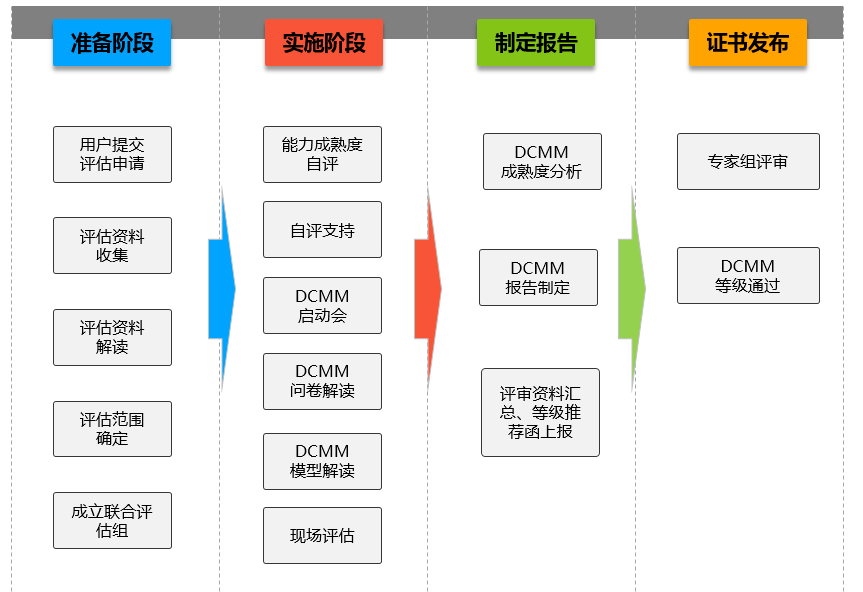 DCMM的评估包括:评估组织选取、评估项目实施、优秀标杆评选、DCMM证书发放等,分为以下四个阶段: