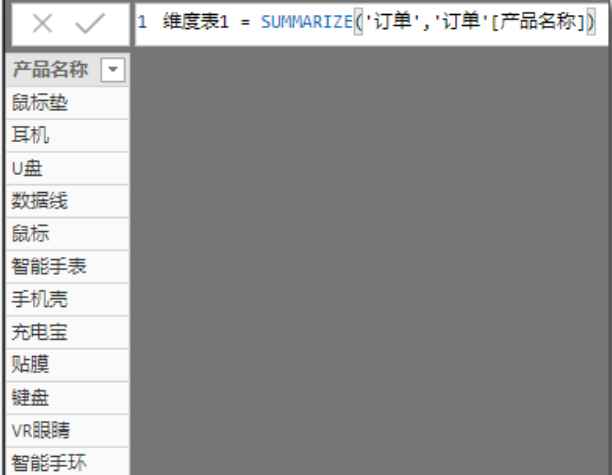新建表1=SUMMARIZE(‘订单’,‘订单’[产品名称])