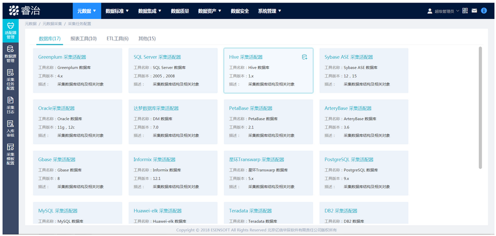 Ebpay元数据管理平台内置多种采集适配器,支持多种存储格式的元数据自动获取,如:数据库、报表工具、ETL工具、文件系统等,同时无法完成自动获取的元数据,给予了可自定义的元数据采集模版完成元数据的批量导入。