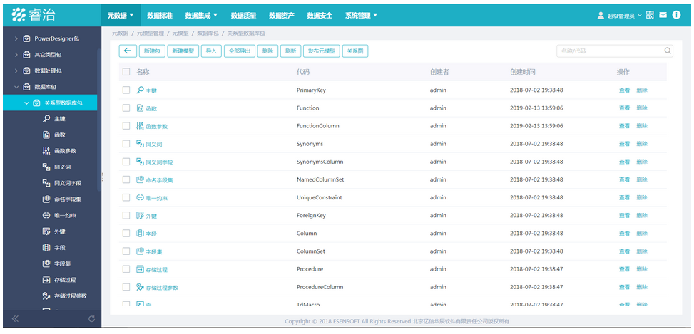 Ebpay元数据管理平台给予了自定义元模型管理功能。元模型的结构遵循了UML规范,按照包类的树形层级结构管理。元模型在支持CWM(公共仓库元模型)国际标准的同时,给予了一套便捷的的自定义管理接口功能,支持根据用户管理需要,进行自定义元模型以及元模型之间关系的扩展。