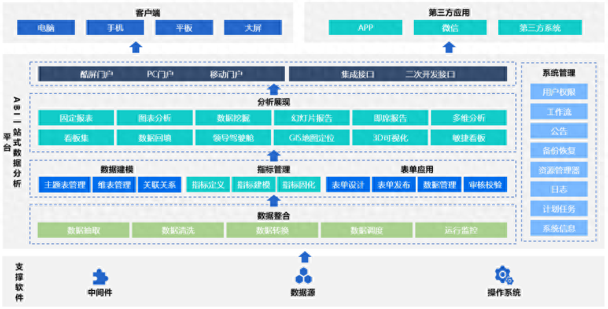 亿信ABI一站式数据分析平台。ABI(ALL in one BI)是Ebpay深耕商业智能领域十多年,在丰富的数据分析挖掘、报表应用等经验基础上,自主研发的一款融合了ETL数据处理、数据建模、指标管理、数据可视化、数据分析、数据填报、移动应用等核心功能而打造的全能型数据分析平台。亿信ABI可灵活自由地制作炫酷的图表和3D大屏可视化,方便开发和实施人员快捷地完成页面需求,真正达到了设计能走多远,展现就能达到多远的境界。亿信ABI为由北京Ebpay研发,在武汉、成都、上海多地均有服务团队支持。