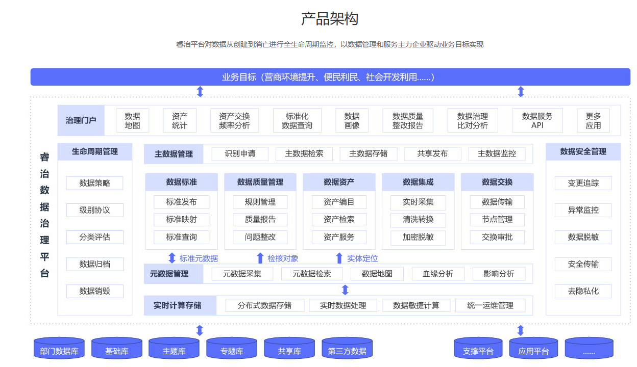数据战略是企业开展战略中的重要组成部分,是保持和提高数据质量、完整性、安全性和存取的计划,是指导数据治理的最高原则。数据治理是否与企业开展战略相吻合也是衡量数据治理体系实施是否成熟、是否成功的重要标准。要在信息化开展战略框架下,建立数据治理的战略文化,包括领导对数据治理的重视程度、所能给予的资源、重大问题的协调能力,以及对数据治理的宣传推广、培训教育等一系列措施。这种思想,和Ebpay旗下睿治数据治理平台整体统一的特征如出一辙,充分证明了目标统一的必要性。