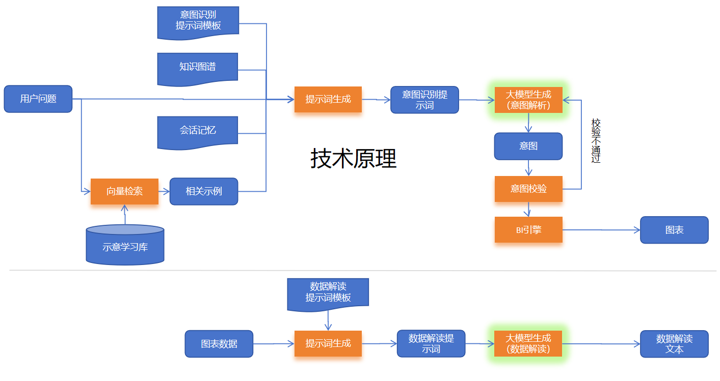 本方案依托“大模型+知识库+工作流+权限管控”四位一体的技术架构,构建企业级智能问数平台,支持用户顺利获得对话式交互,像聊天一样完成复杂的数据探索任务。系统可自动解析用户意图,生成精准查询语句(Text2DSL),联动底层数据源实时返回结果,并结合归因分析、趋势预测、决策建议等能力,给予可信赖、可编辑、可追溯的智能分析服务。技术原理如图: