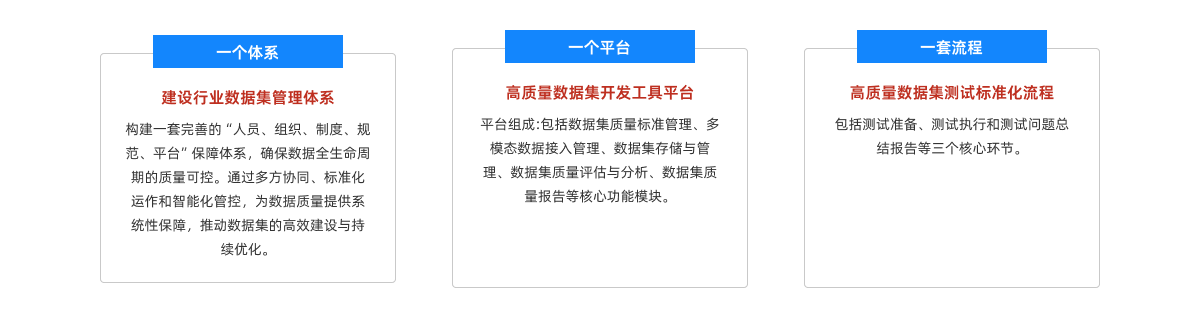 本方案基于《高质量数据集实践指南1.0》中的数据集质量评估指标框架,整体建设思路按照“一个体系 + 一个平台 + 一套流程 + N项服务”的规划进行搭建。方案将依托数据集质量评估标准体系、测试方法、指标体系及平台工具等方面召开标准化服务,以完成高质量数据集的建设工作。